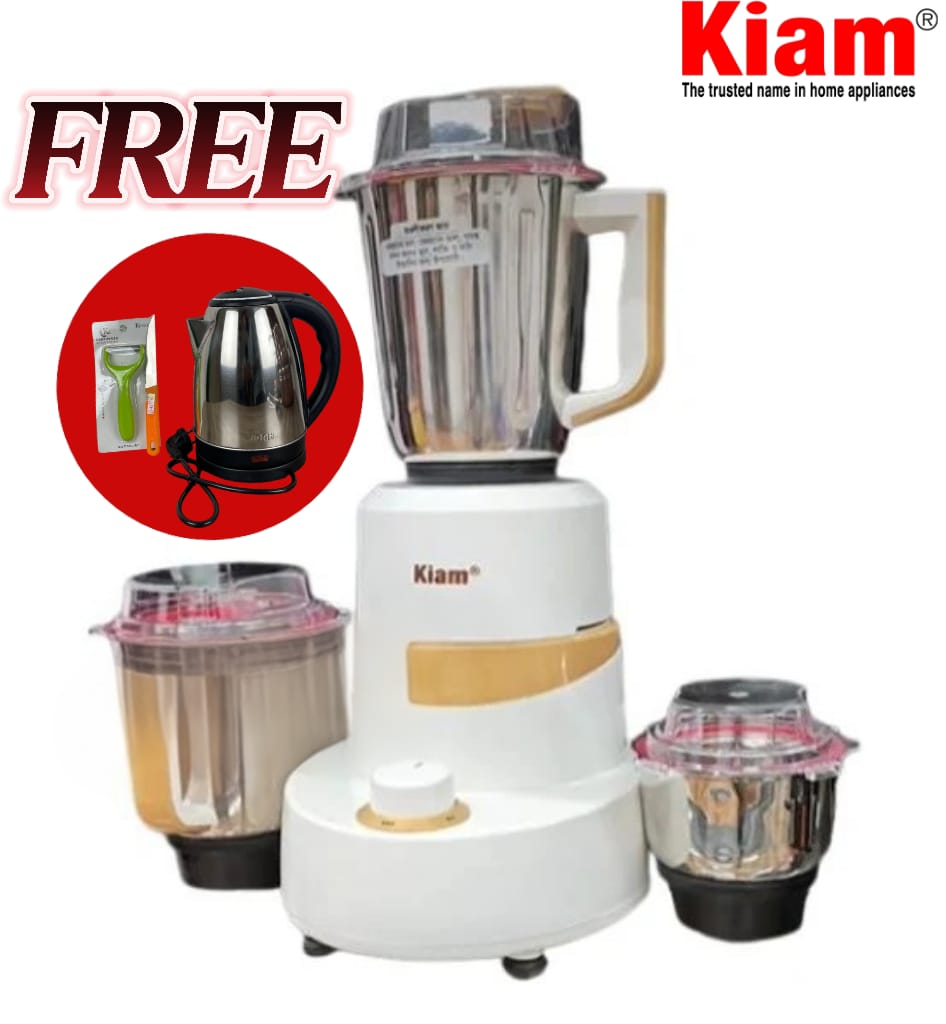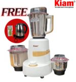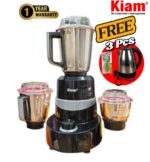 Get the powerful Kiam Turbo Mix 1200W Mixer Grinder (3 Jars) with FREE GIFTS 🎁 – knife, peeler, electric kettle & spoon. Heavy-duty motor, durable jars & budget-friendly price at Alliomart.com!